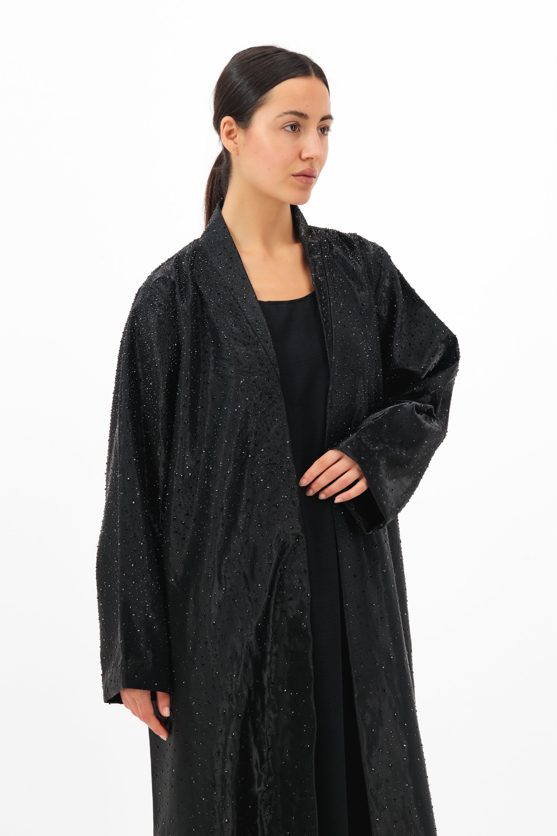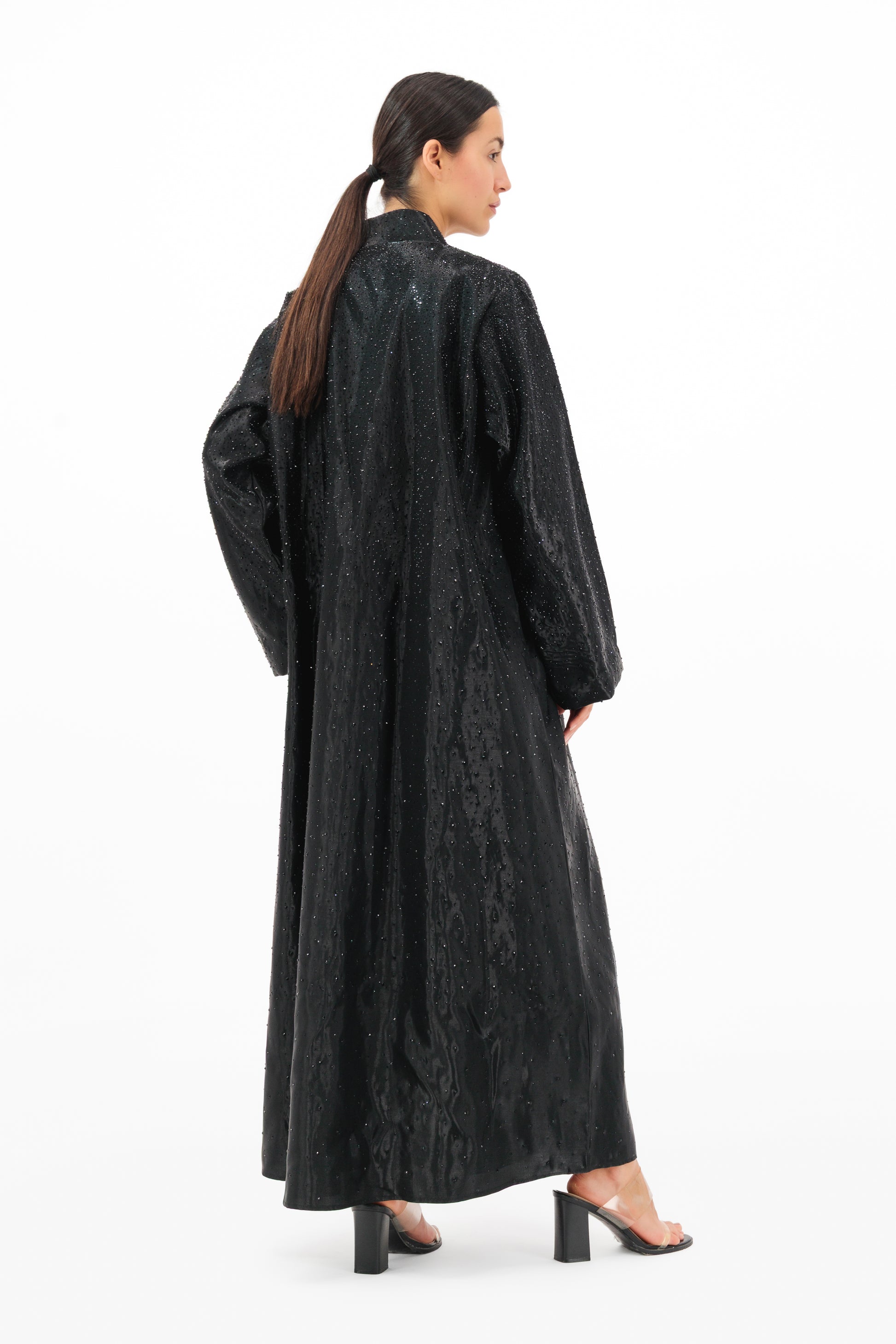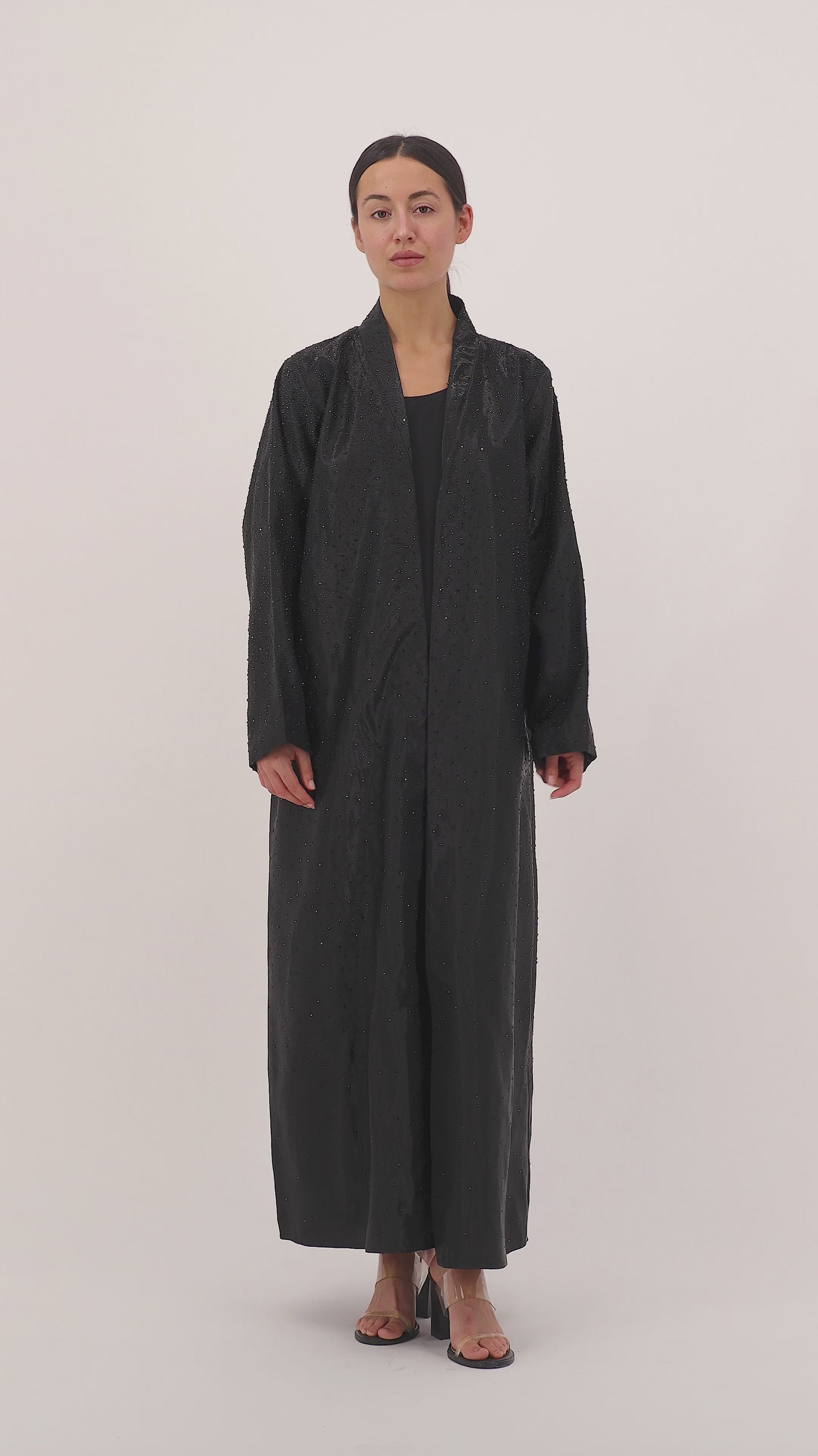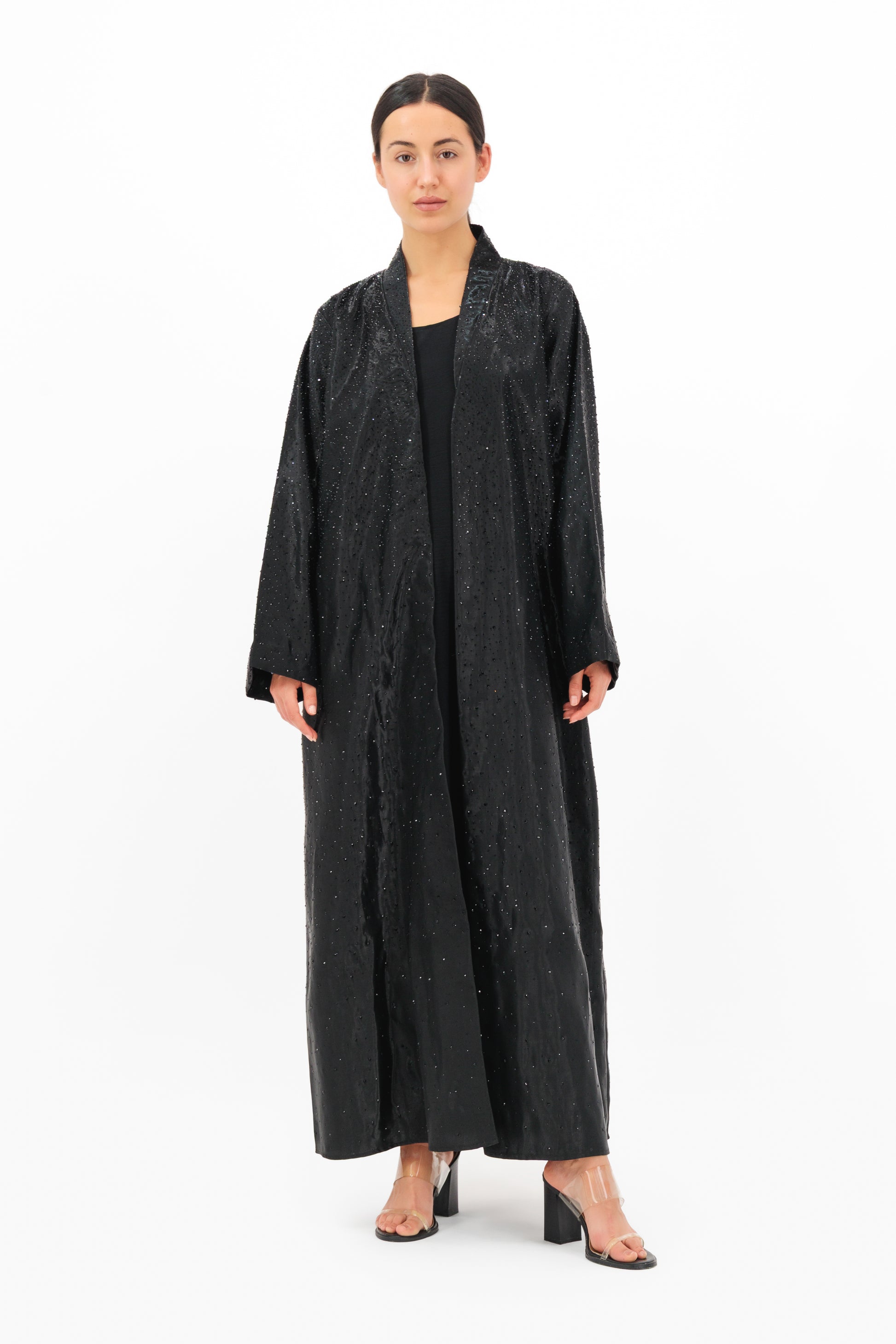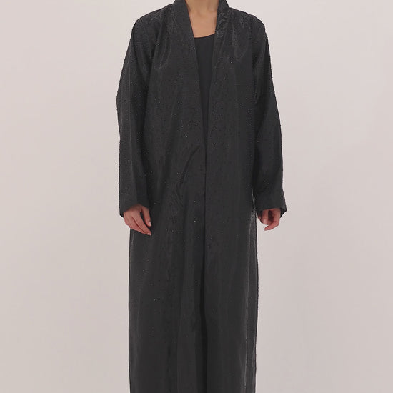 Designed in luxurious Shimmer Micasa fabric, this abaya exudes understated glamour with a soft, luminous finish. Its clean silhouette and subtle shine catch the light effortlessly, making it the perfect choice for evening elegance or elevated daywear. Lightweight with a graceful drape, it offers a flawless blend of sophistication and modern allure. Includes a matching shailah for a seamless, polished look.